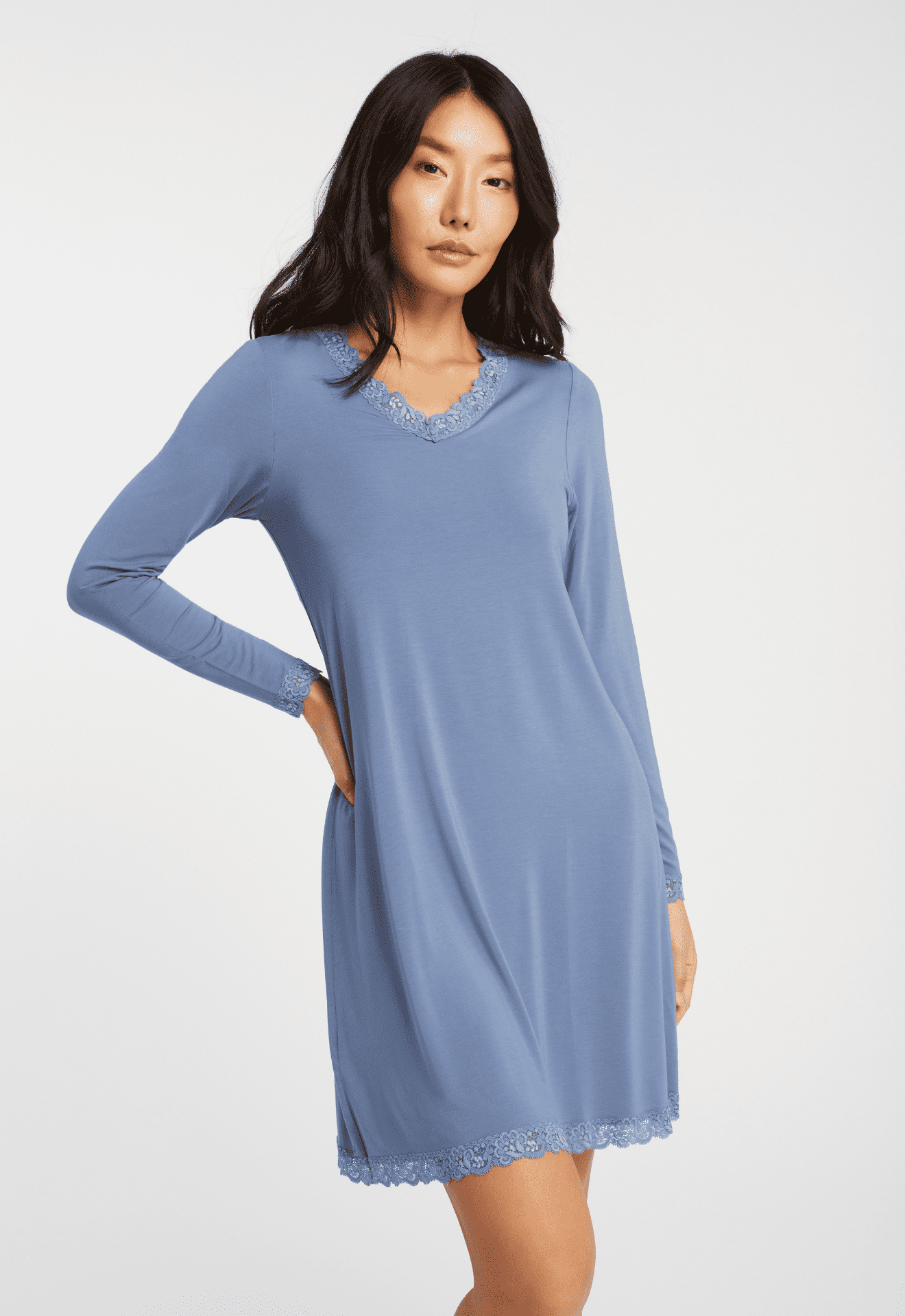 • Accents de dentelle à l’ourlet, à l’encolure et aux poignets
